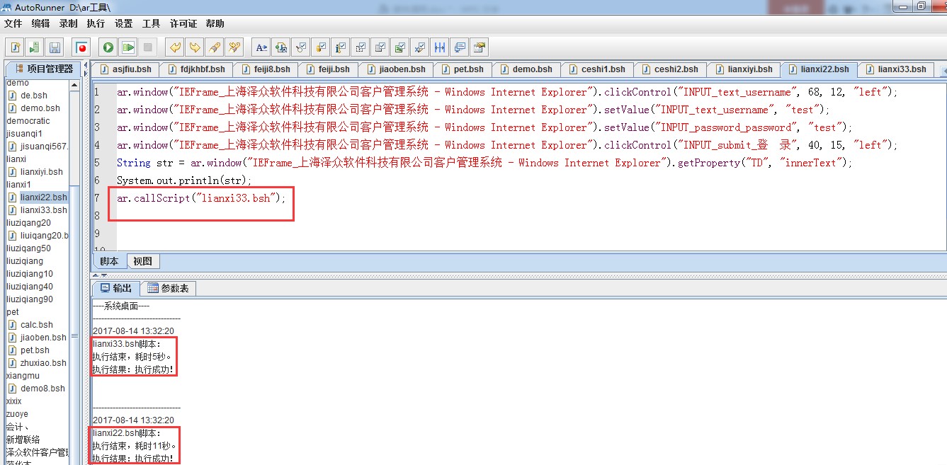 自动化测试工具AutoRunner脚本的调用,在脚本的录制和平常的脚本维护过程中,我们一般都会选择将脚本尽量的小巧化,这样既方便对脚本的逻辑的审查和脚本的日常维护,但是我们的测试过程中通常都会涉及到多场景的混合或叠加,这个时候我们发现一个个的脚本单独执行已经完成不了我们的才会任务,这个时候就需要我们把一个个的小脚本串联起来去执行,实现我们的测试,AutoRunner脚本调用的语句是:ar.callScript("lianxi33.bsh");