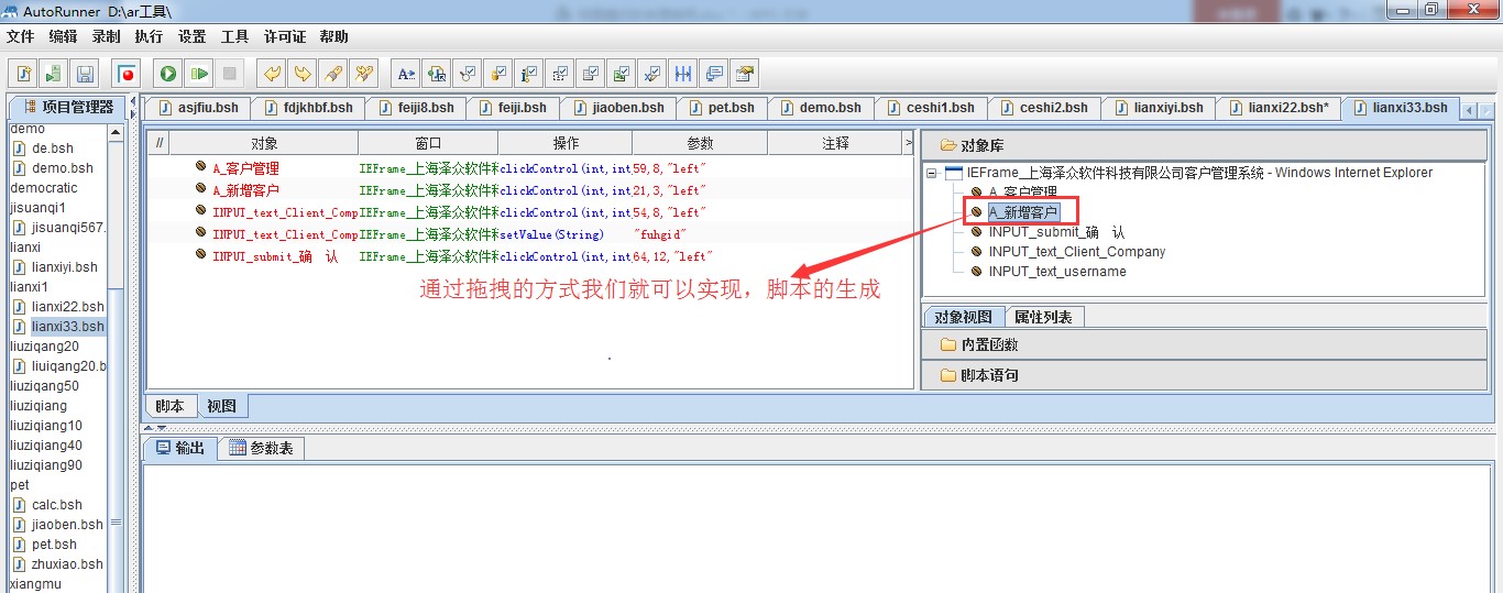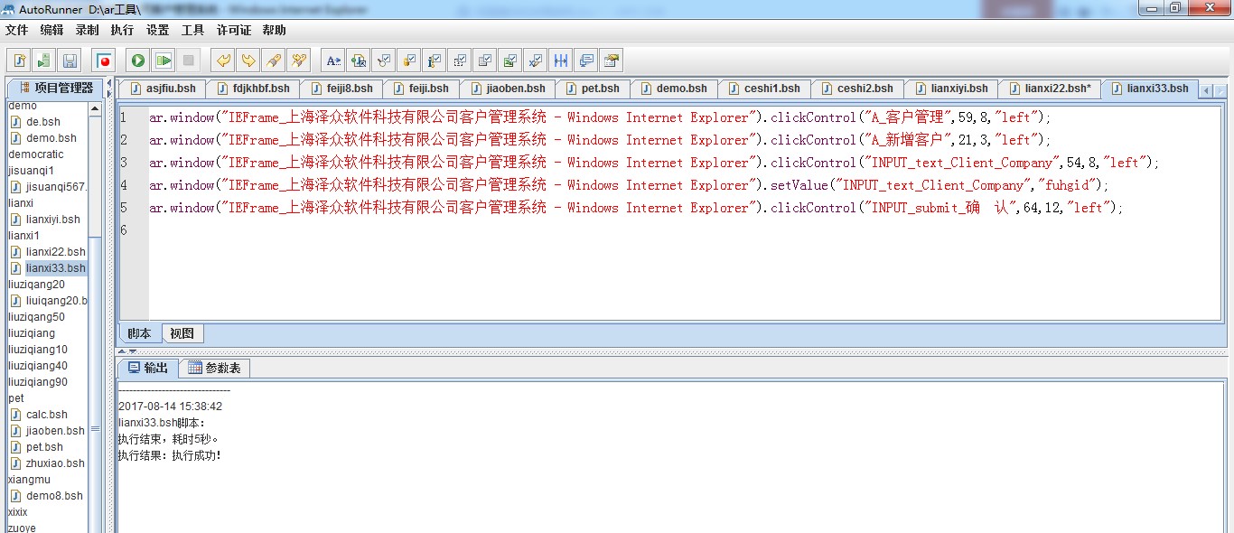 下面我们试着用一用这个神奇的功能,在脚本lianxi22.bsh里面,我录制登录的操作,在脚本lianxi33.bsh里,录制新增客户的脚本;然后再脚本lianxi22.bsh里面调用lianxi33.bsh,实现登录完成后直接新建联系人的整个测试过程: