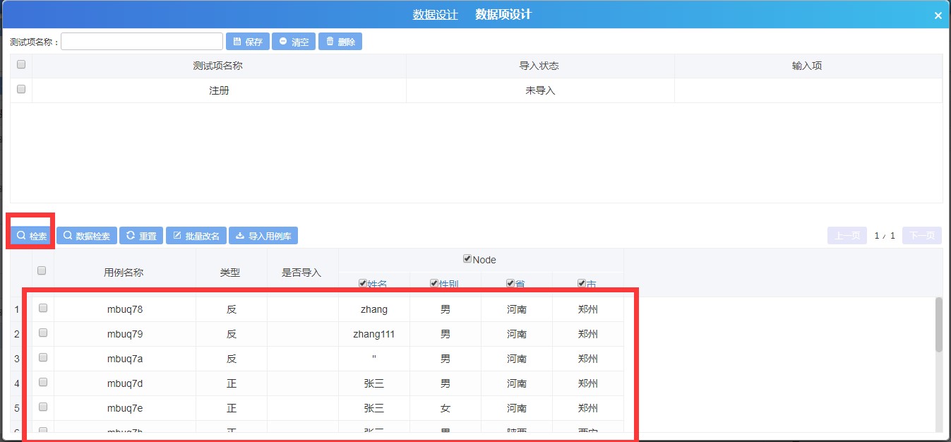 点击数据项设计,在数据项中输入测试项,点击检索,根据设置的业务规则,自动生成正反测试用例;