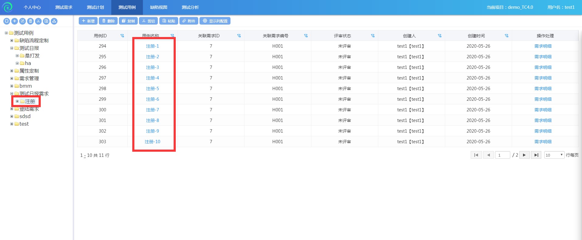 选中测试项名称,点击导入后,自动添加到测试用例模块;