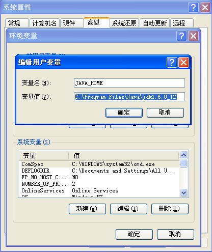 在变量名中输入:JAVA_HOME(注意大小写以及下划线),在变量值中把刚刚复制的路径,JDK安装目录所在路径(默认安装C:ProgramFilesJavajdk1.6.0_12,用户需要找到自己实际的安装路径来设置变量值)如下图: