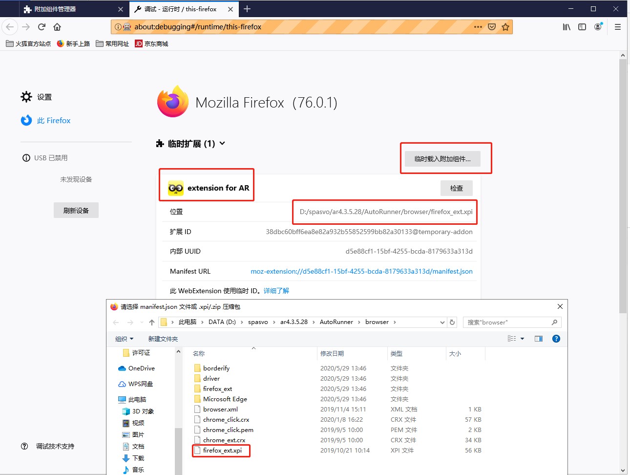 第三步,我们点击临时载入附加组件,找到AR安装目录下的火狐浏览器插件,如下图所示组件即加载成功;