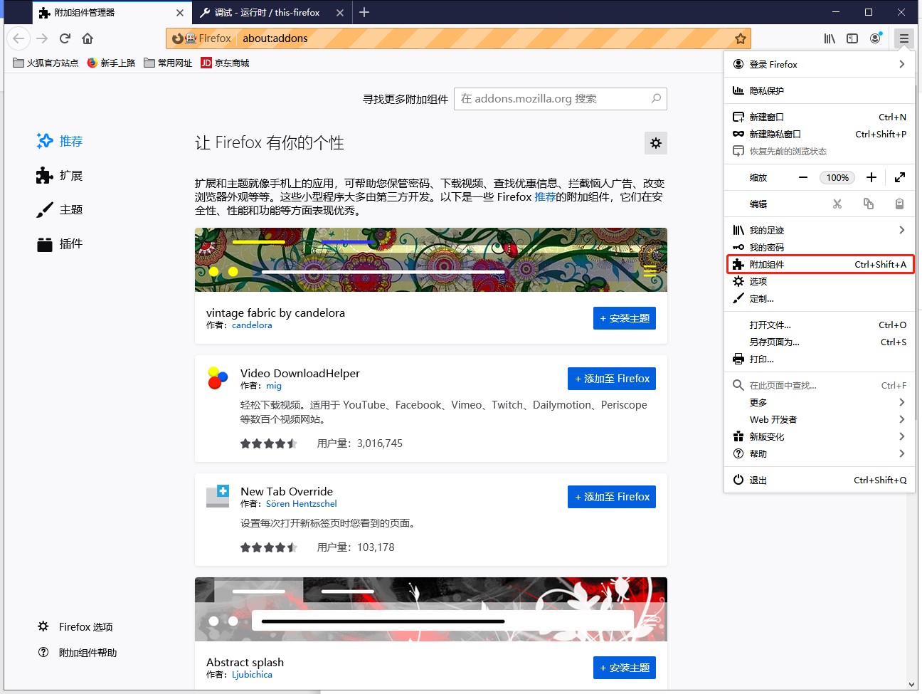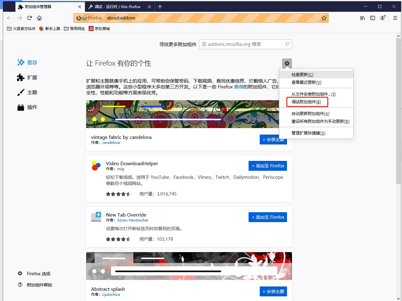 第二步,点击火狐右上角设置中的附加组件选项,然后点击弹出页面右上角的设置图标,选择调试附加组件选项,如下图所示;