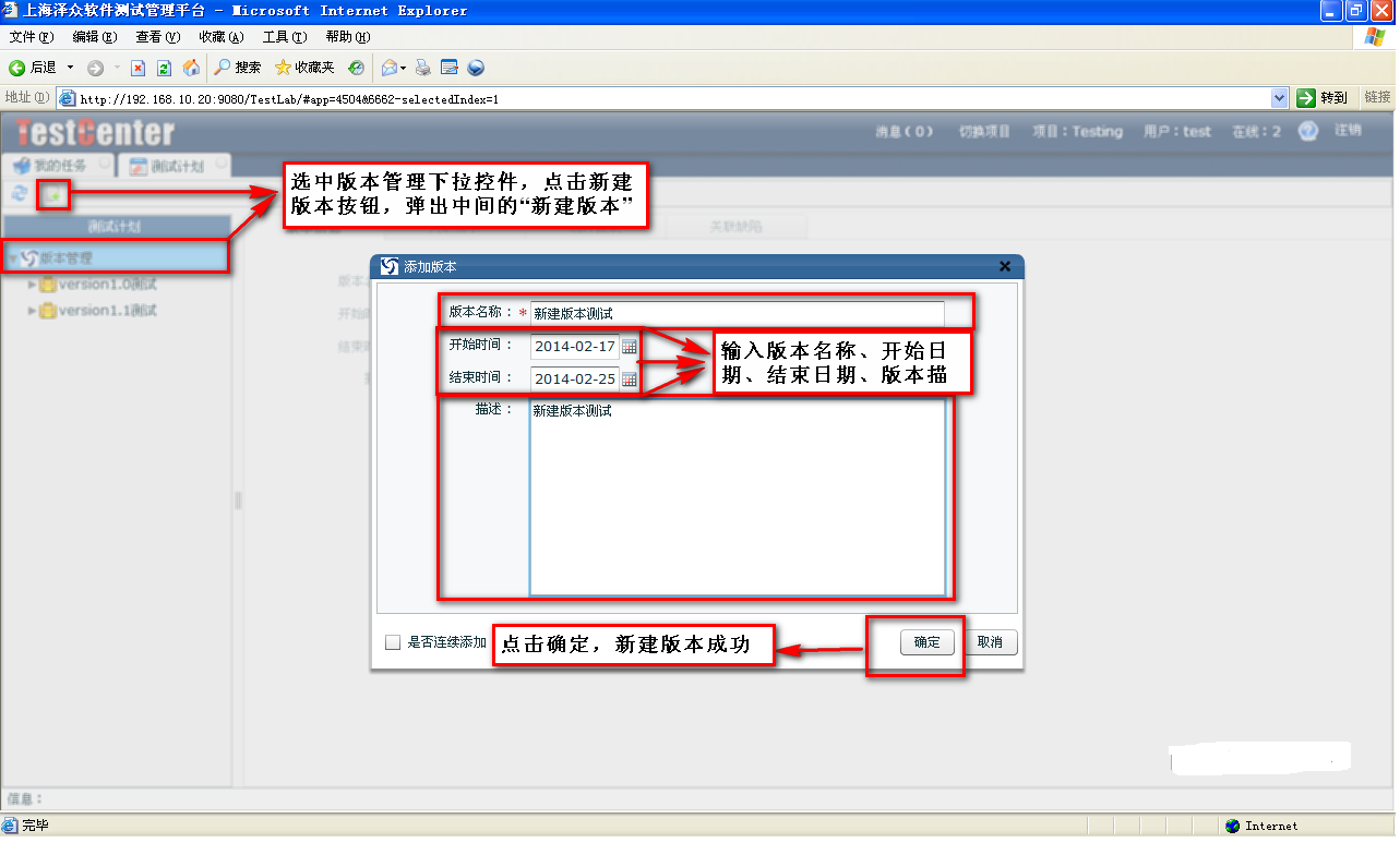 新建测试版本;处理流程:点击TestCenter图标测试计划测试计划选中版本管理单击“增加版本”按钮。限制:选中默认版本管理才可以添加新版本 详细操作:见下图