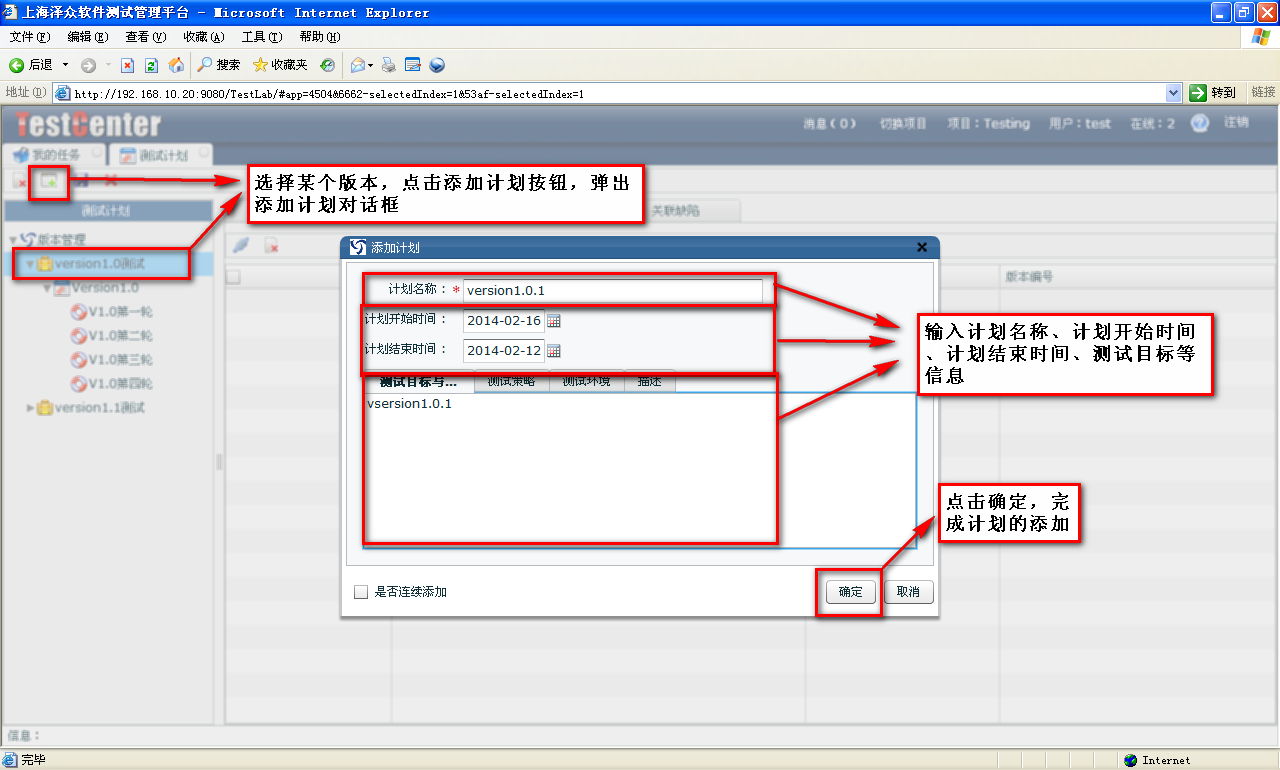 新建测试计划; 功能描述:对计划的“添加”;处理流程:点击TestCenter图标测试计划测试计划选中版本管理->选中某个版本单击“增加计划”按钮。限制:选中默认版本才可以添加新计划。 详细操作:见下图