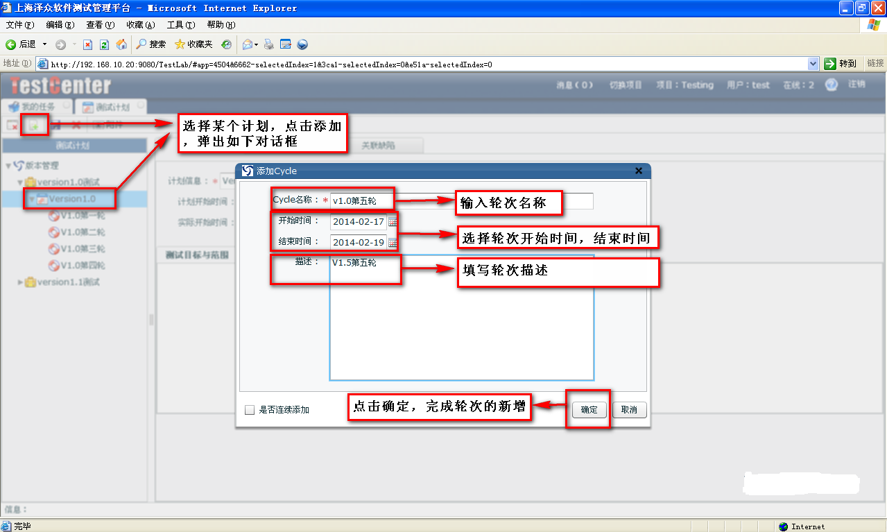 新建轮次; 功能描述:对Cycle的“添加”。处理流程:点击TestCenter图标测试计划测试计划选中版本管理->选中某个版本->选中某个计划单击“增加Cycle”按钮。限制:选中默认计划才可以添加新Cycle。详细操作:见下图