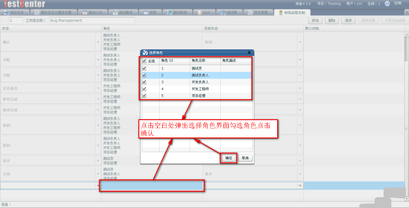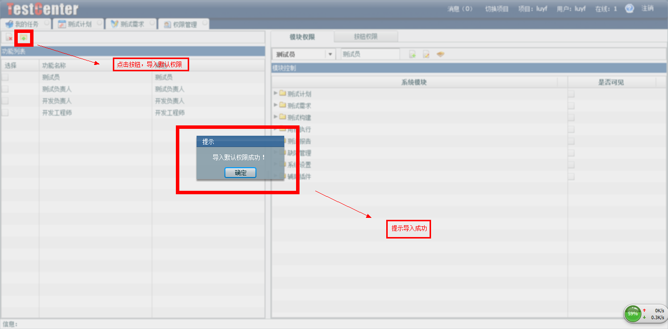 功能描述:“权限设置”是对各个模块中用户是否可以编辑分配权限(在系统权限管理界面选择人员对“测试计划”、“测试需求”、“测试构建”、“执行”、“测试报告”、“缺陷管理”、“测试环境”、“系统设置”等选项进行设置)。 处理流程:系统设置权限设置 。 限制:以具有编辑权限权力的用户登入系统,选择项目;