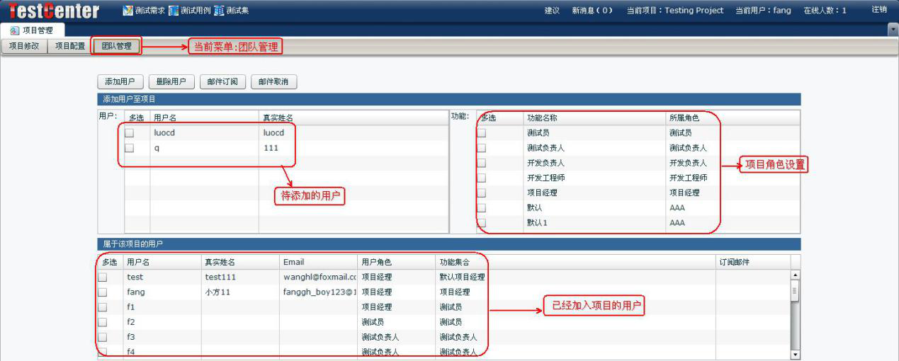 功能说明: 添加用户:选择用户->然后选择角色(可以多选)->点击<添加用户> 完成把用户添加到项目中。