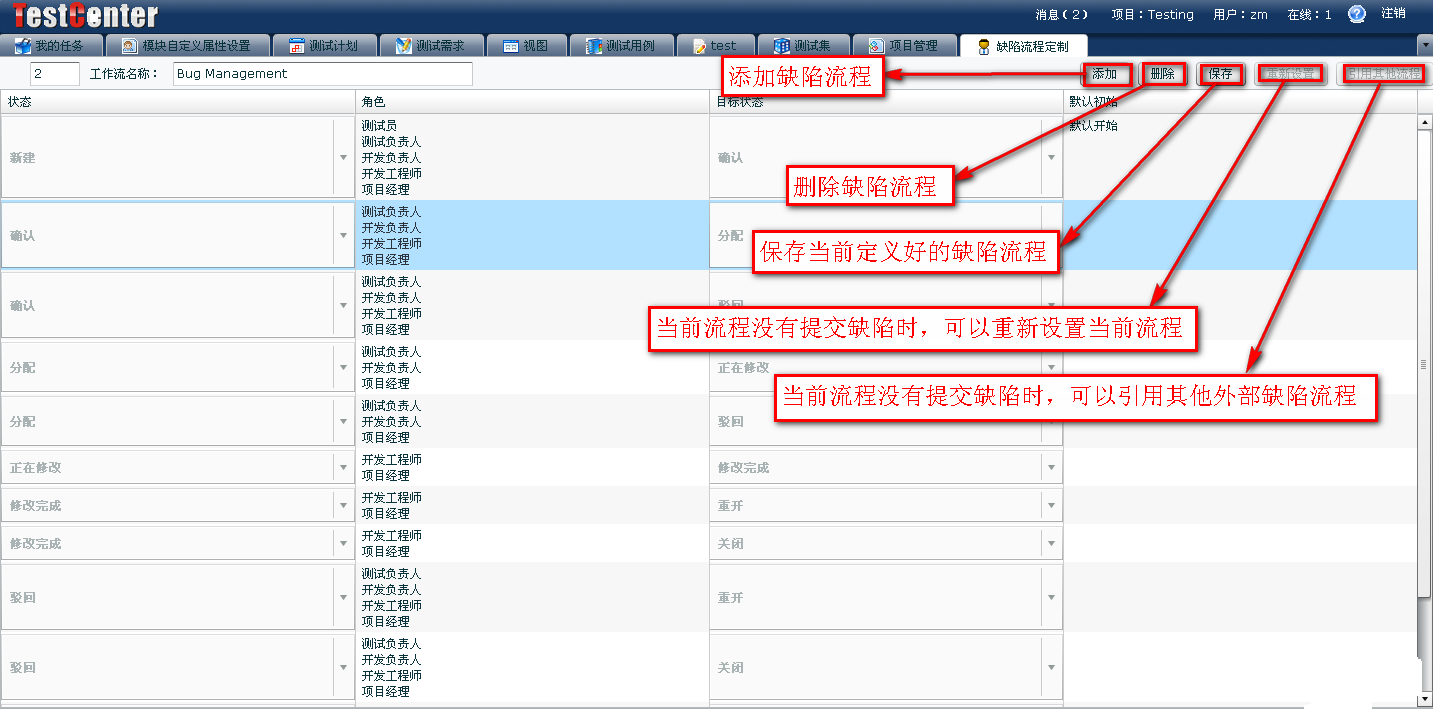功能描述:定义缺陷流程功能。处理流程:系统设置缺陷流程定制,单击“添加”按钮,”保存“按钮,”重新设置“按钮,”引用其他流程“按钮。限制:无。 详细操作:见下图。
