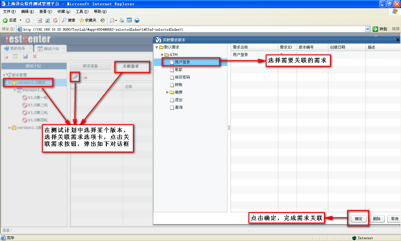 处理流程:点击测试管理工具TestCenter图标测试计划测试计划选中版本管理选中某个版本单击“关联需求”标签,单击“关联需求版本”按钮。 限制:选中默认版本才可以关联需求版本。