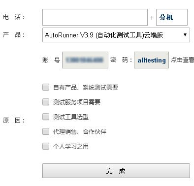 1、填写申请信息,http://www.spasvo.com/Register/Register.asp(见图1); 2、选择“AutoRunner(自动化测试工具)云端版”,系统自动注册账号。(账号为申请手机号码,密码统一为“alltesting”)(见图2); 3、下载安装客户端,按要求登录,即可使用(见图3);