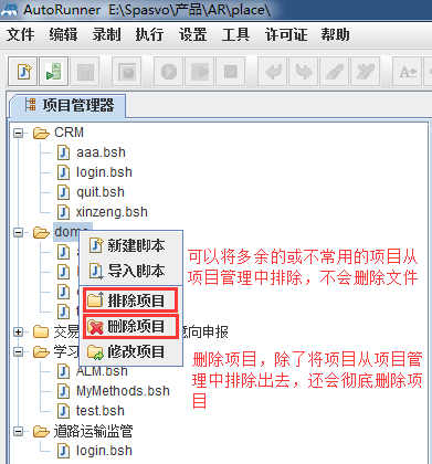 AR实现了对项目进行系统的管理,我们可以对创建/导入的项目进行排除、删除、修改等操作:(在项目文件夹处单击鼠标右键即可选择要进行的操作)