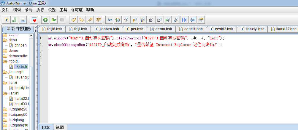 自动生成脚本语句:ar.CheckMessagerBox(“#32770_自动完成密码”,”是否希望Internet Explorer 记住次密码?”);