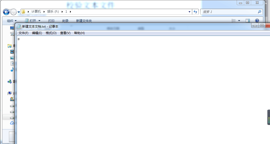 1.首先,我们在F盘下新建一个文本文档(记事本),然后在第一行编辑一个字母:“s”
