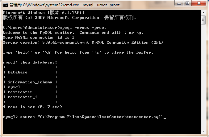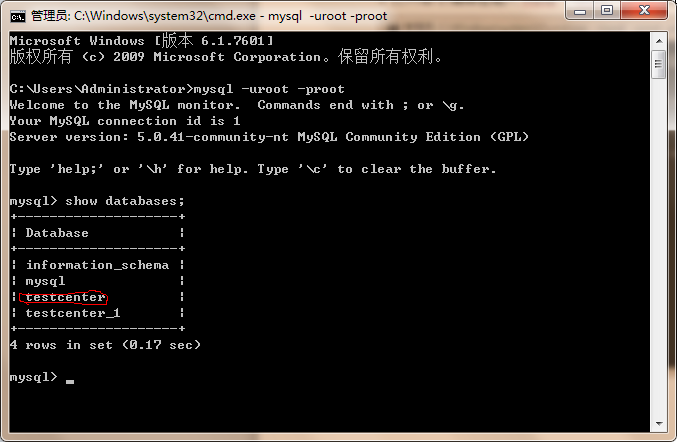 2 输入show databases;按回车,如图:如果没有红圈里的项,则表明基库未导入成功。