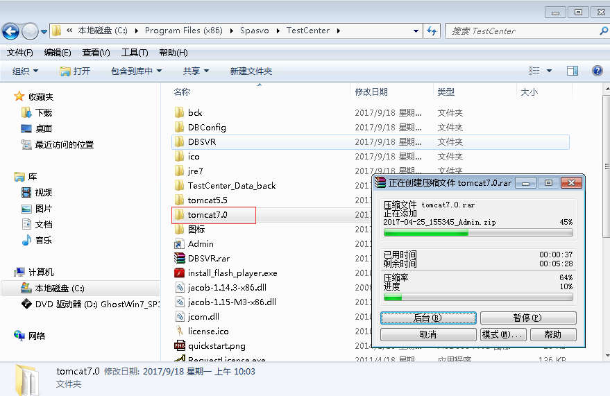 压缩迁移服务器TC安装目录里下tomcat7文件夹(D:Program Files (x86)SpasvoTestCenter omcat7.1)并拷贝至新的部署服务器。