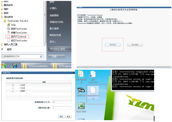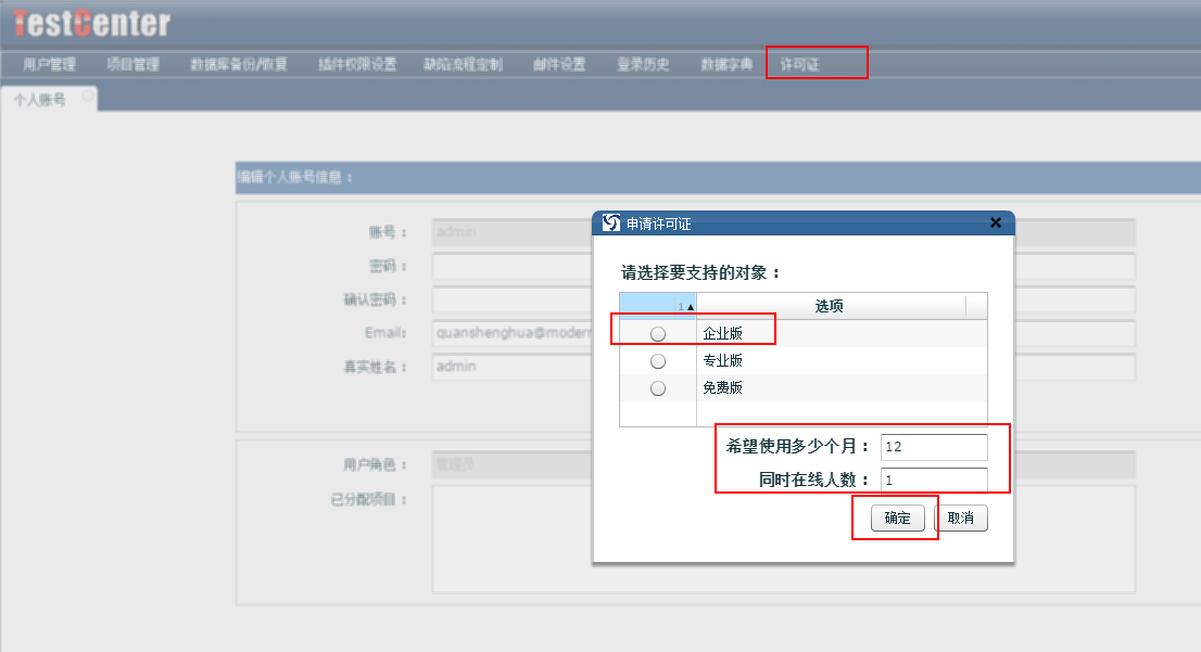 先点击启动TestCenter图标,打开Tomcat服务器。然后在服务器上访问http://localhost:8080/TestLab/Admin.html登录管理员账号(admin 111111),点击许可证,选择申请许可证,弹出申请许可证对话框,选择需要申请的类型,使用的时长,以及同时在线人数,点击确定按钮,即可导出license。若系统已过期不能登陆后台,可以直接访问