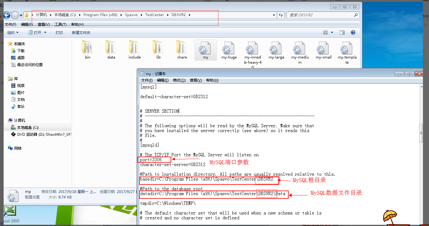 b) 停止spasvoDBServer服务,先删除原安装包中的DBSVR文件夹,再将迁移的DBSVR 文件夹拷贝进来,可修改my.ini配置文件,如下图所示。其中MySQL端口号如果冲突,则修改为其他端口号,如果不冲突可以使用默认的3306端口。basedir和datadir参数根据实际情况配置。