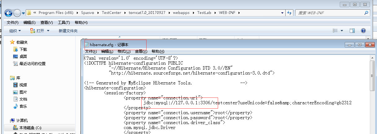 d) 查看TestCenter omcat7.0webappsTestLabWEB-INF文件夹中的hibernate.cfg.xml文件,确保图中的ip和port配置正确,IP为TC数据库所在服务器的IP地址,port为MySQL数据库my.ini文件中配置的端口号。
