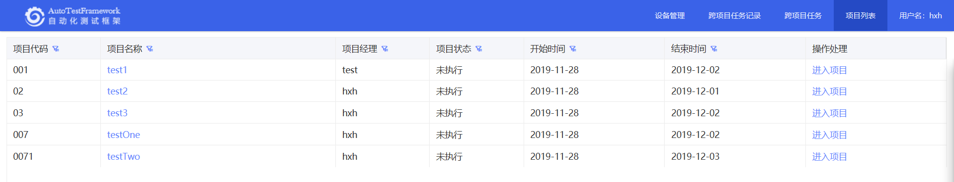 使用新建的项目经理用户登录前台地址:http://localhost:8082/TestLab/login.html,可以登录成功,并且我的项目列表会显示新创建的项目。点击“进入项目”进入项目。