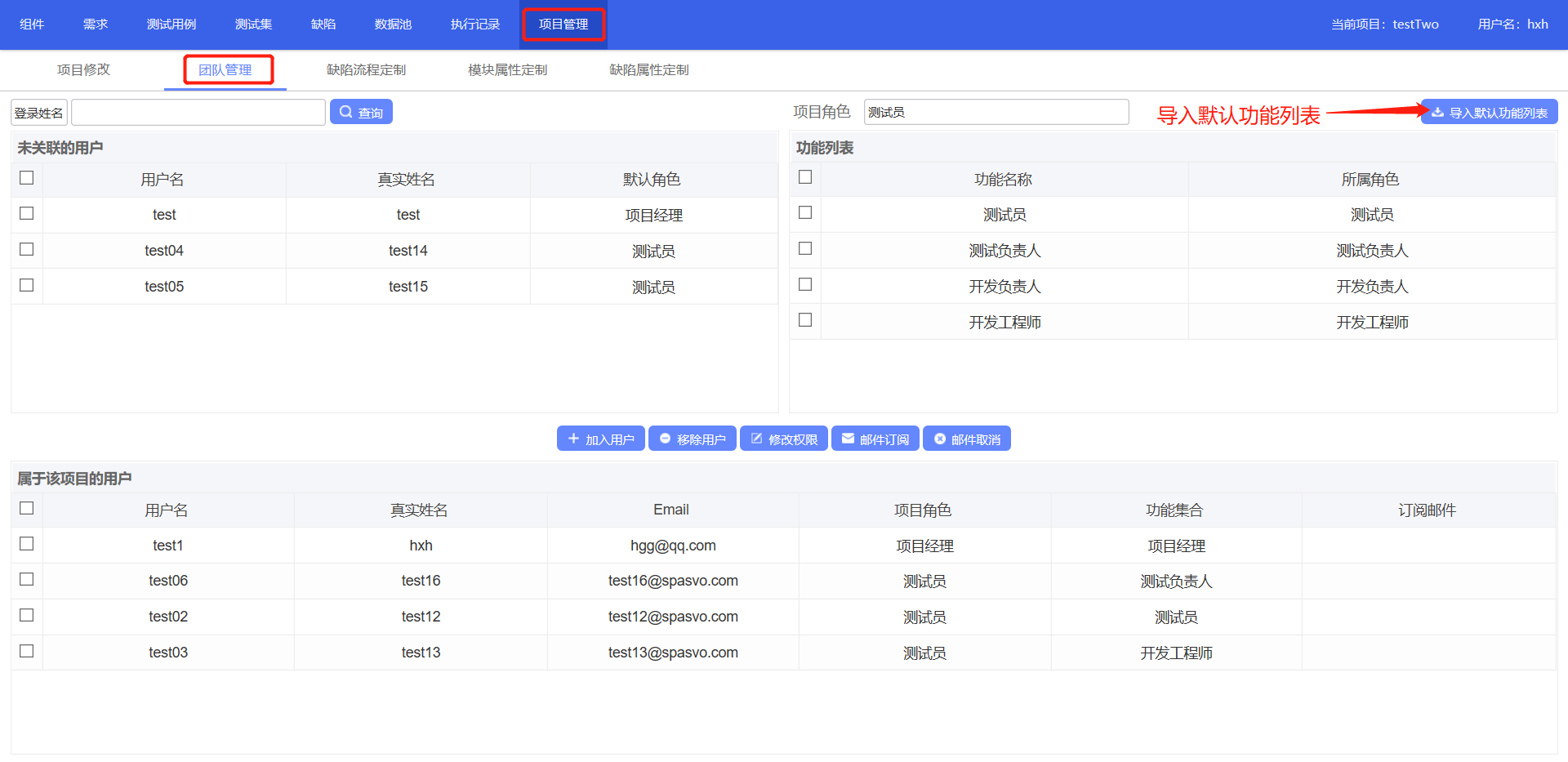 进行默认权限的导入与分配,该功能是为了给项目其他用户分配权限,系统默认的角色包括测试员、测试负责人、开发负责人、开发工程师。 |