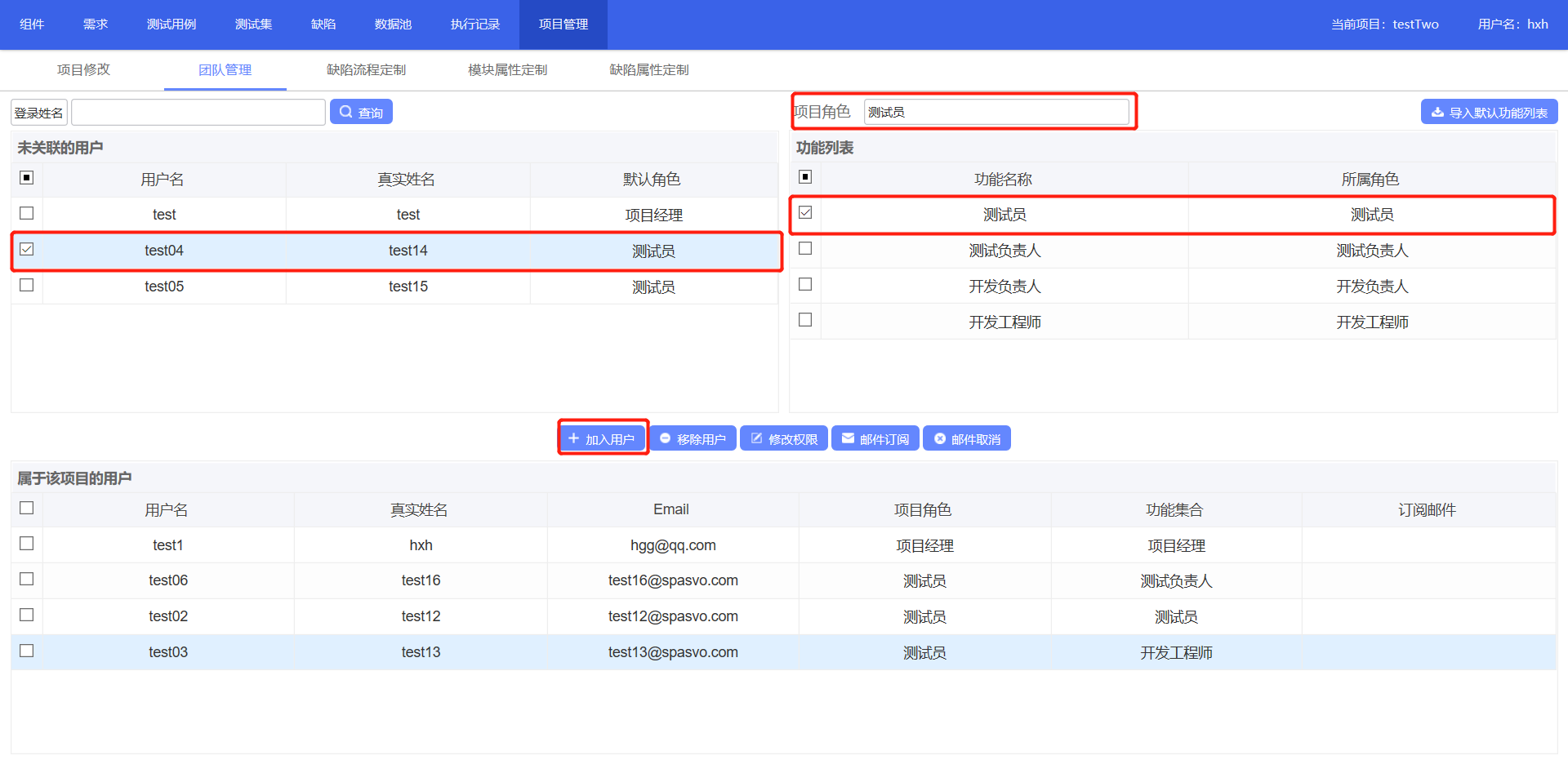 1.勾选未关联的用户(待加入项目的用户) 2.选择项目角色 3.勾选功能列表(用户权限) 4.点击加入用户,即可成功添加。 |
