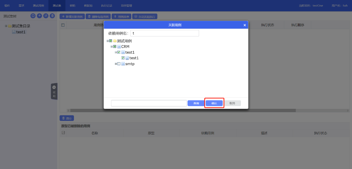 2. 点击新增关联用例 3.展开测试用例组,勾选需要添加的用例 4.点击确定添加测试集用例成功 5.展开用例路径展示相应添加的测试用例 |