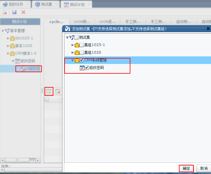 4.点击添加测试集,勾选需要执行的测试集 5.点击确定,轮次中显示绑定的测试集信息 |