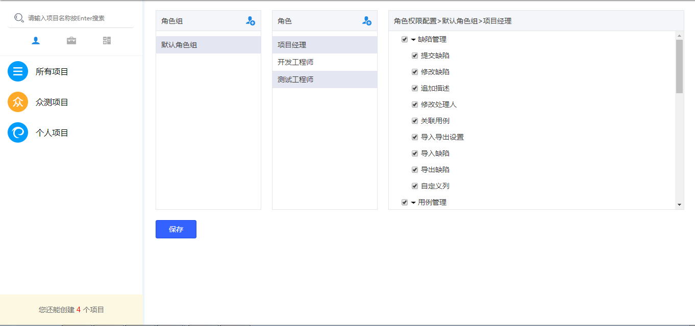 点击进入【角色管理】,新增角色组,新增角色,进行角色权限配置