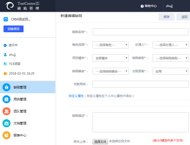 进入项目,默认定位在缺陷管理模块,点击新建缺陷,新建缺陷