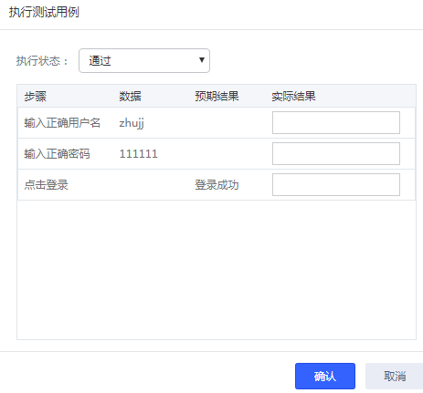 1.点击“用例执行”,出现上图界面,填写实际结果; 2.查看实际结果与预期结果是否一致; 3.根据情况,选择执行状态“通过”、“未通过”、“阻塞”; |