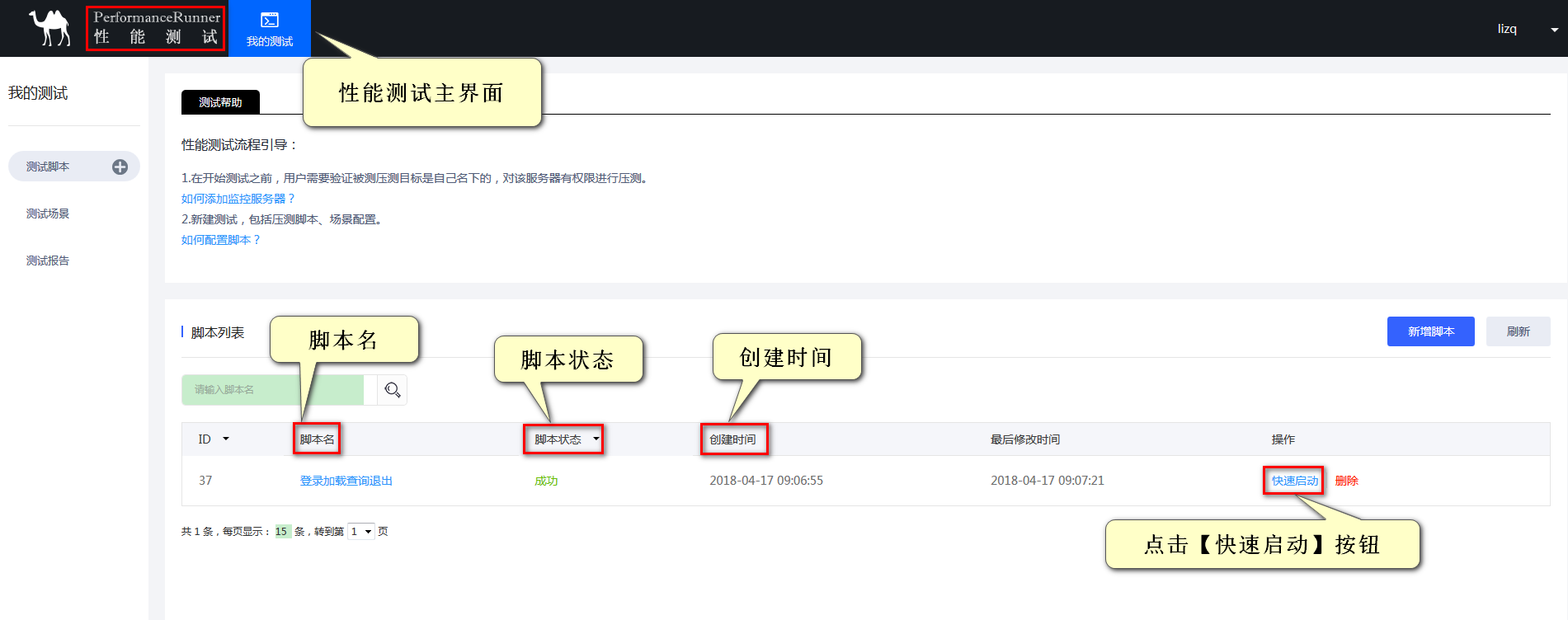 控制台的脚本列表页列出了所有定义的脚本。您可以查看脚本名称、脚本状态、创建时间,并单击【快速启动】按钮,快速启动脚本。