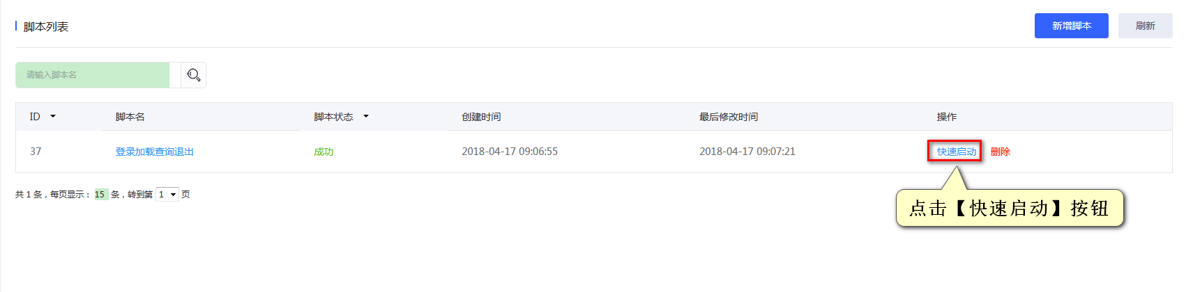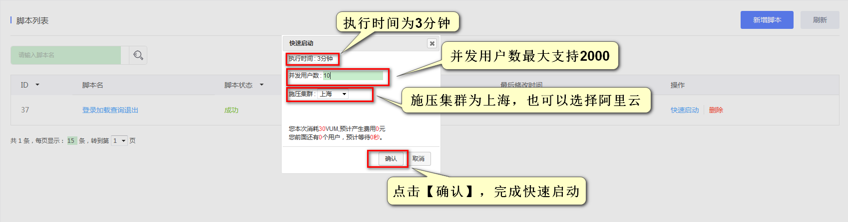 脚本编写完成后,在脚本列表页单击脚本右侧的快速启动按钮即可运行脚本。系统会自动创建脚本对应的场景与任务。执行时长默认3分钟,并发用户数上限 2000。