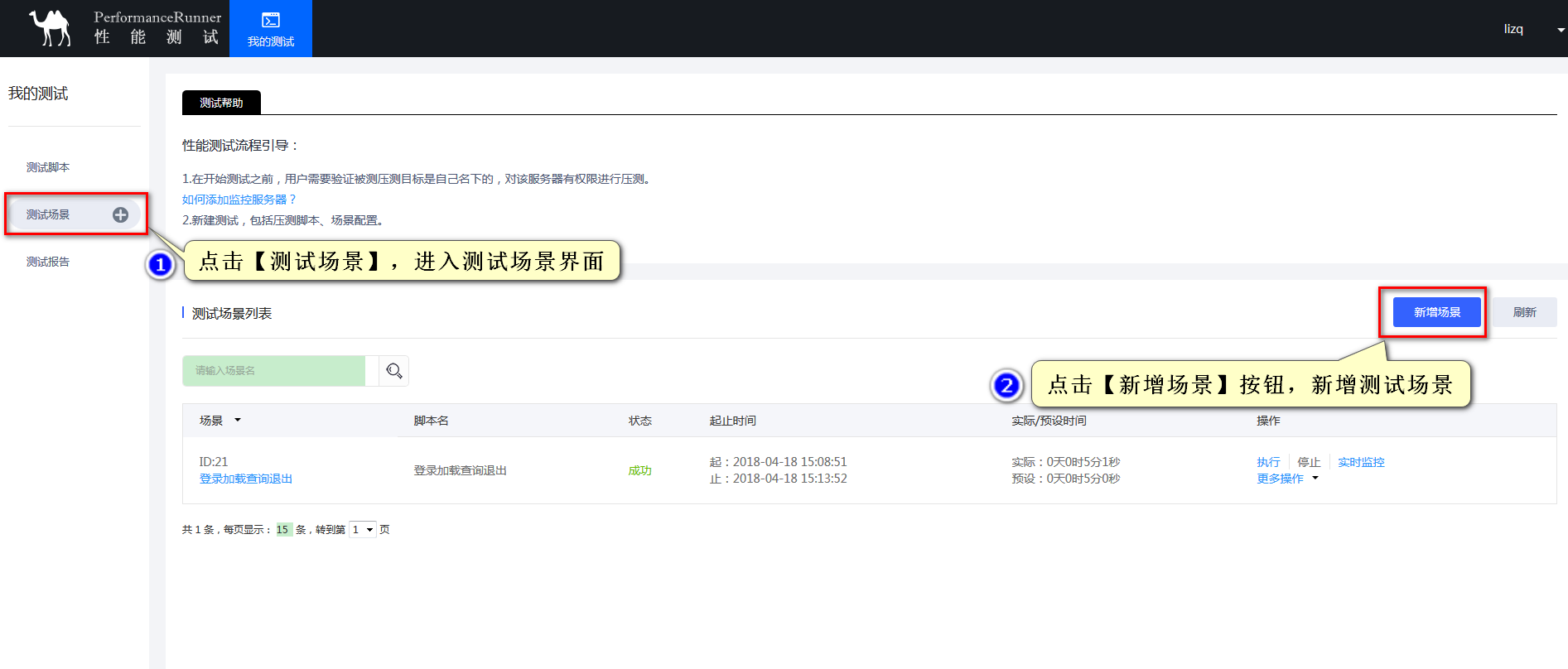 1) 在控制台左侧导航栏选择测试场景,单击页面右上角的【新增场景】按钮,进入场景创建/编辑页面。