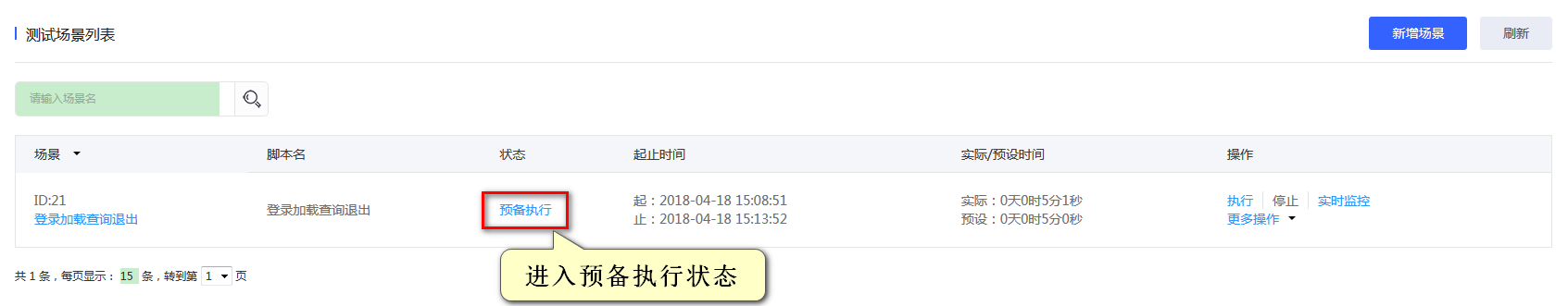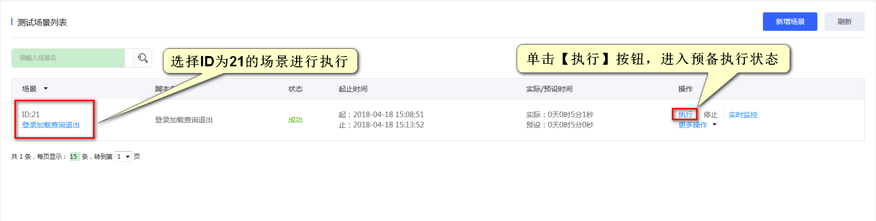 Step2:在场景列表中,找到要压测执行的场景,单击右侧操作选项里的【执行】按钮。