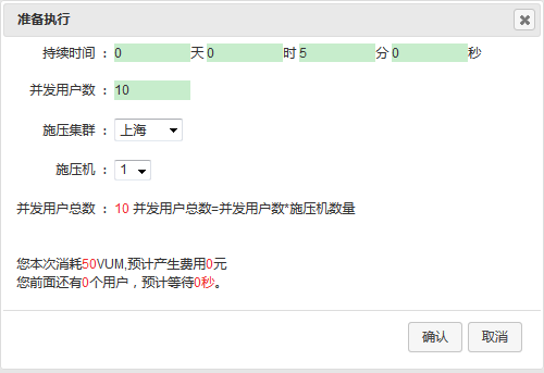Step3:在弹出的执行场景对话框,确认持续时间和并发用户数 没有问题之后,单击确认启动压测场景。