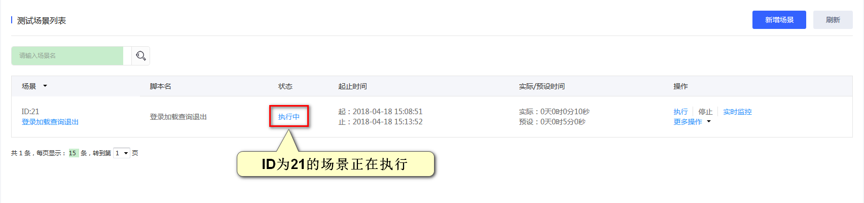 场景进入“执行中”的状态之后,压测任务会一直执行到持续时间结束。您可以单击操作选项的停止按钮来手动结束本轮压测。