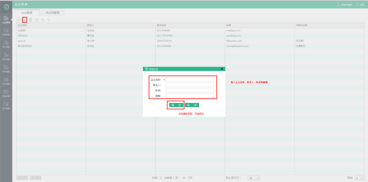 进入到【企业管理】页面,点击点击添加图标,进入创建企业界面,输入相关信息,点击确定按钮,企业添加完成。