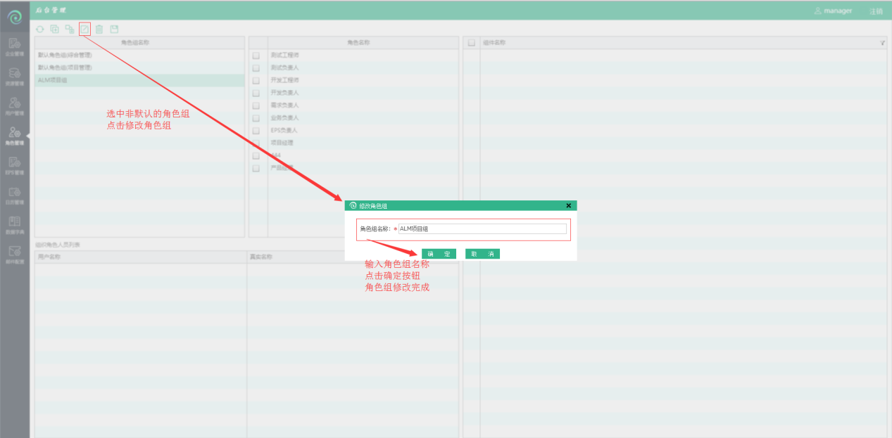 选中需要修改信息的非默认角色组,点击修改角色组图标,可修改角色组信息。