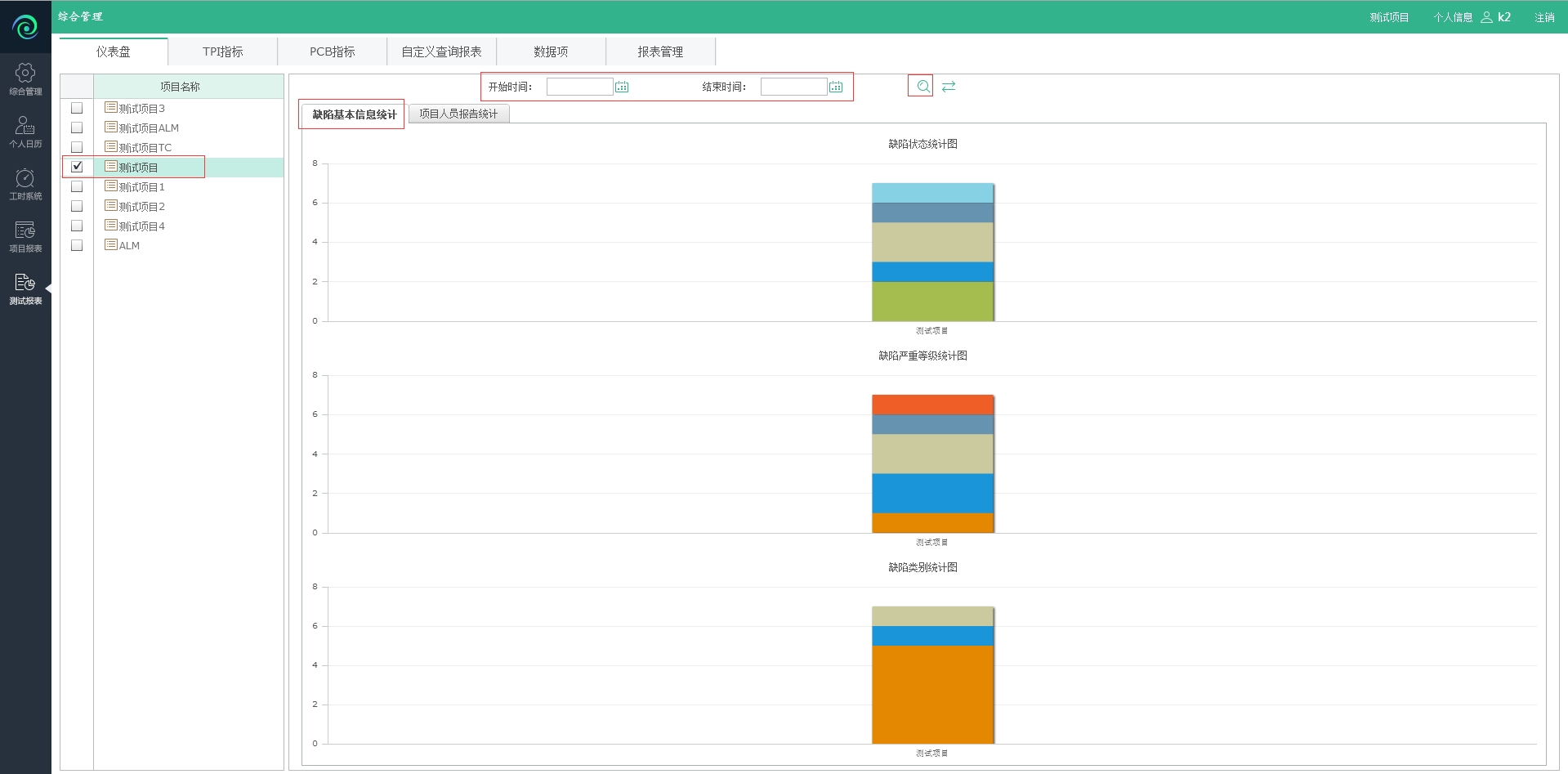 点击【仪表盘】进入到仪表盘模块。仪表盘以项目为单位,给项目群管理人员进行缺陷基本信息、项目人员报告统计。