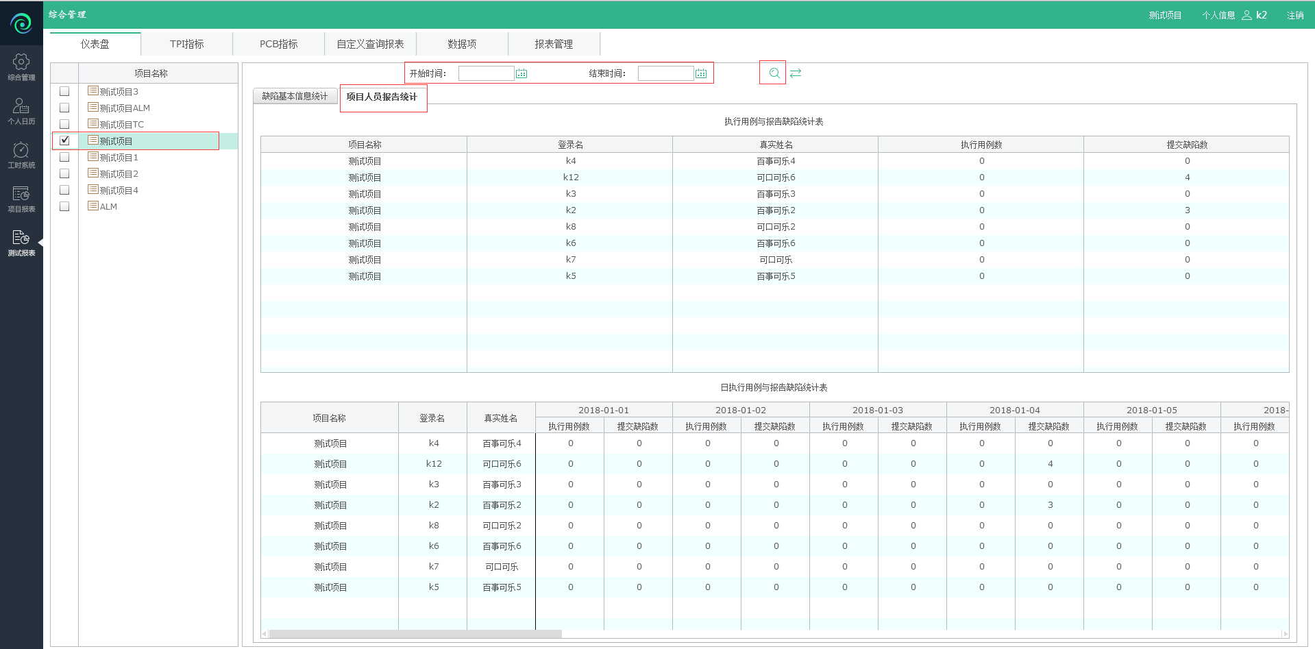 项目人员报工统计:根据选中的项目,以列表的形式,对项目中人员提交的缺陷与执行的用例进行统计,有执行用例与报告缺陷统计表、日执行用例与报告缺陷统计表。