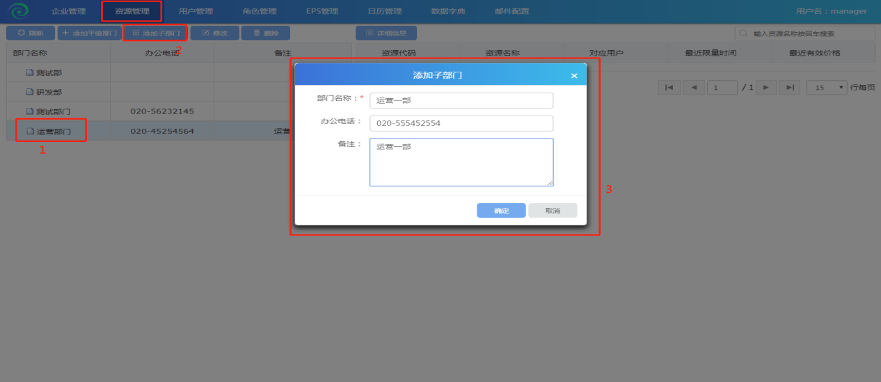 选中部门,点击【添加子部门】按钮,进入创建子部门页面,可在部门下添加子部门,输入子部门信息,点击确定按钮,子部门添加完成。