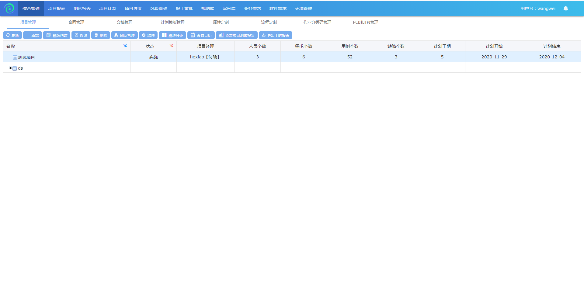 点击【项目管理】进入项目管理模块,项目管理模块主要是对项目进行新增、修改、删除项目以及项目团队管理,双击可以查看项目报表详情等。