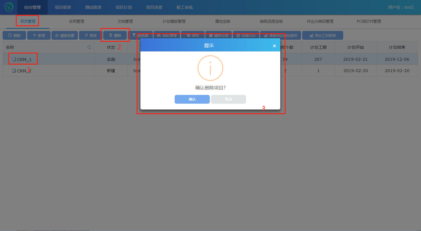 选中项目,点击删除,弹出删除提示框,确认后删除成功;