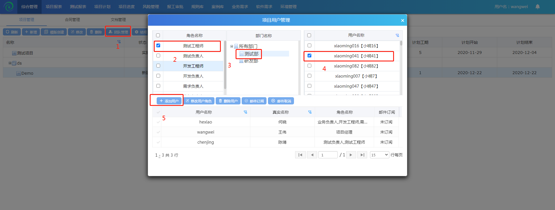 添加用户:选择角色(可以多选)->选择用户->点击【添加用户】按钮,把用户添加到项目中