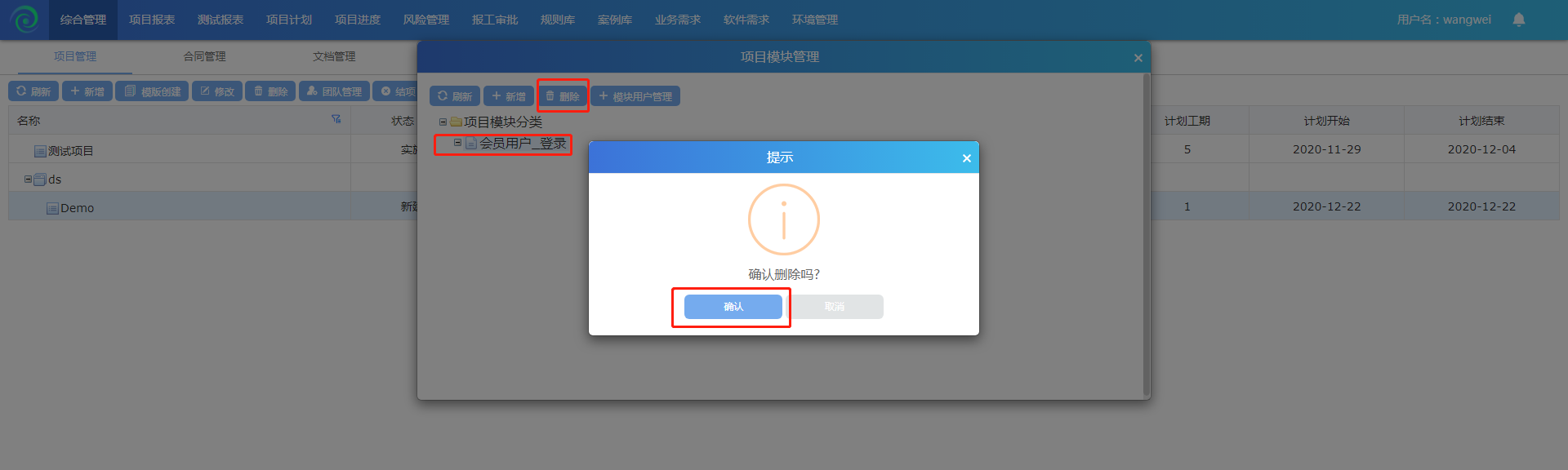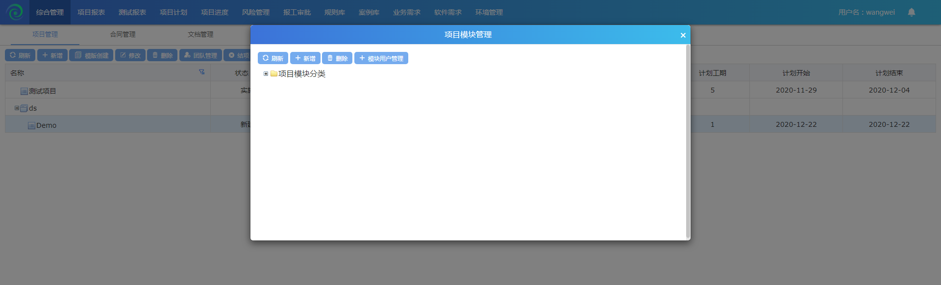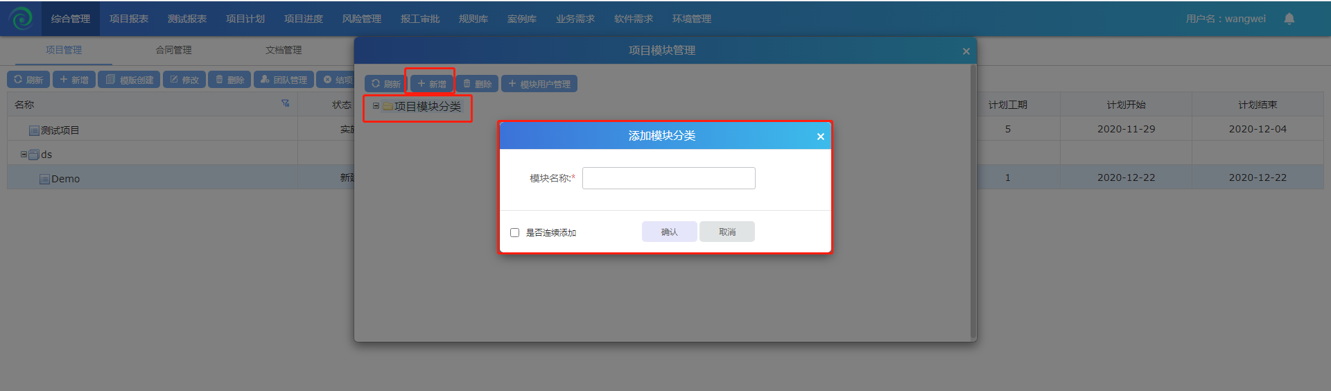 选中默认模块分类,点击新增后,弹出添加模块分类后,输入模块名称,确认后新增成功;