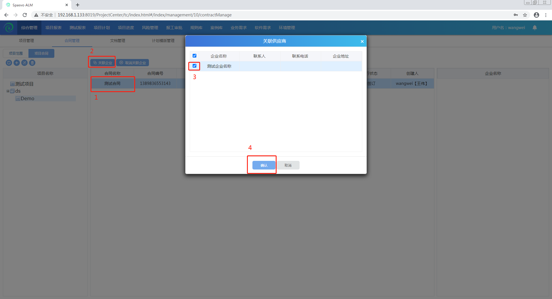 选中项目合同,点击关联企业;弹出关联企业界面后,勾选企业,确认后关联企业成功;