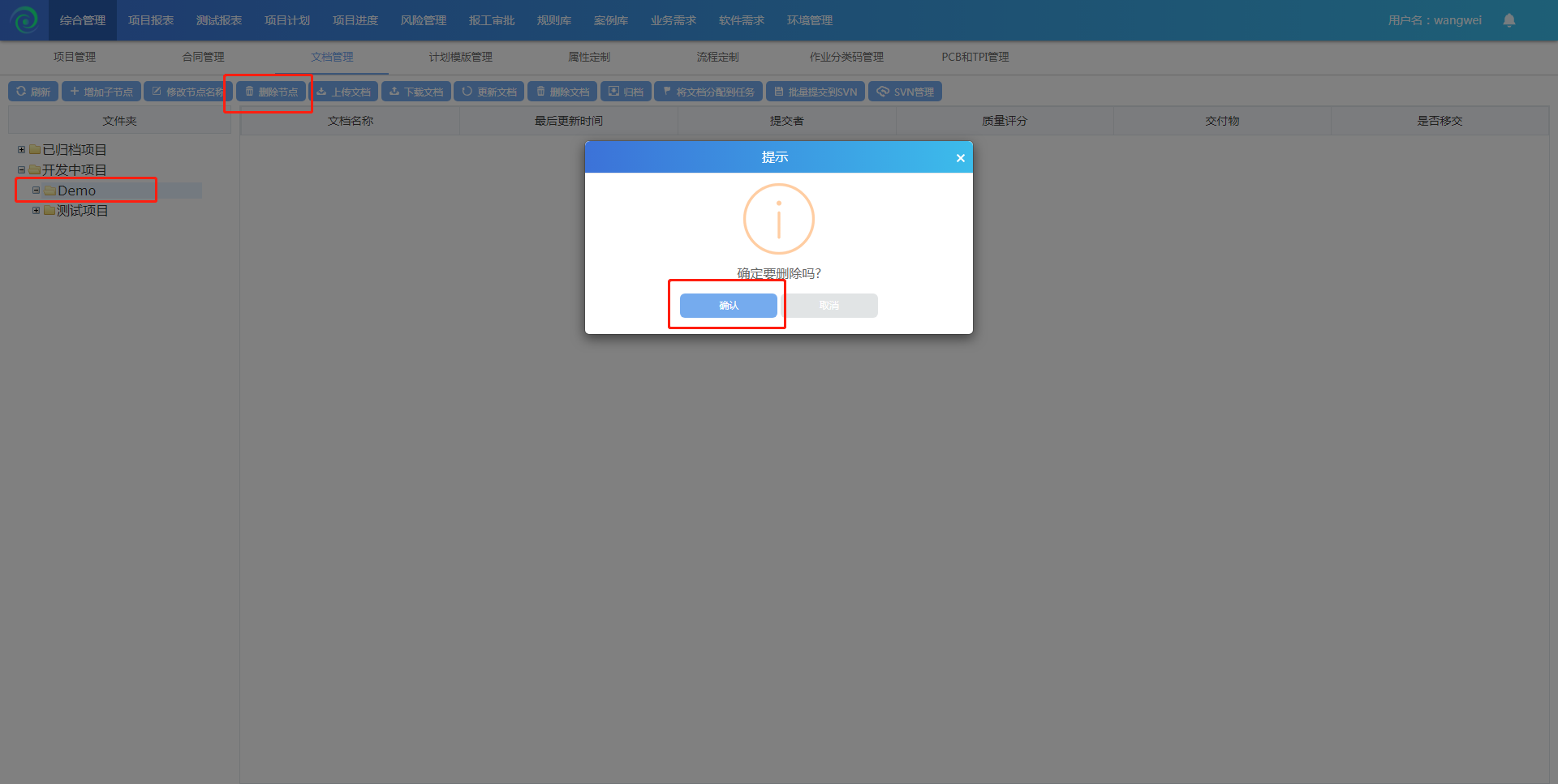 选中子节点,点击删除节点,确认后删除成功;(注:节点下没有文档的可以直接删除,节点下有文档的需要先删除文档);