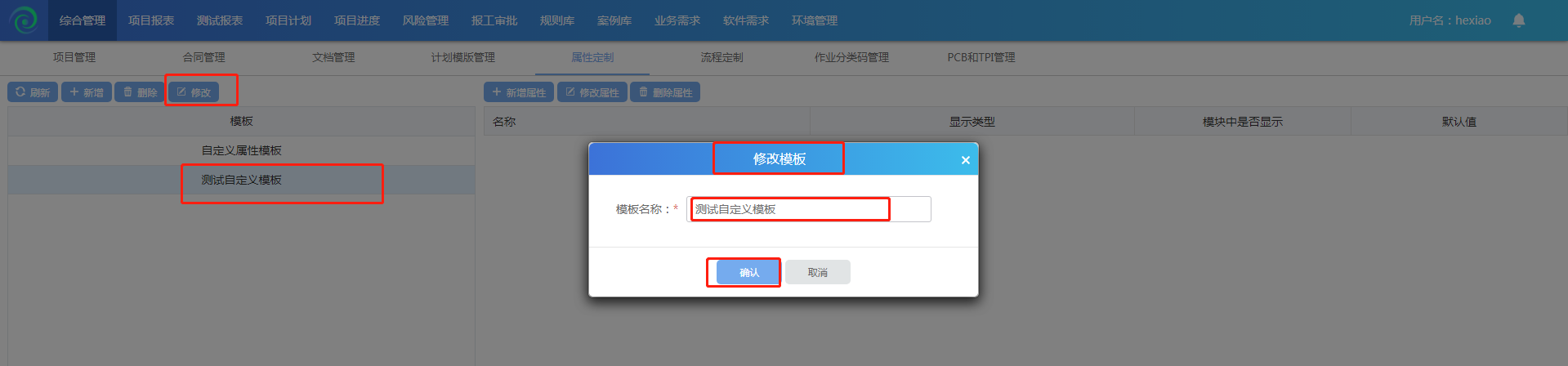 选中一个属性模板,点击修改,输入属性信息,确认后修改成功;