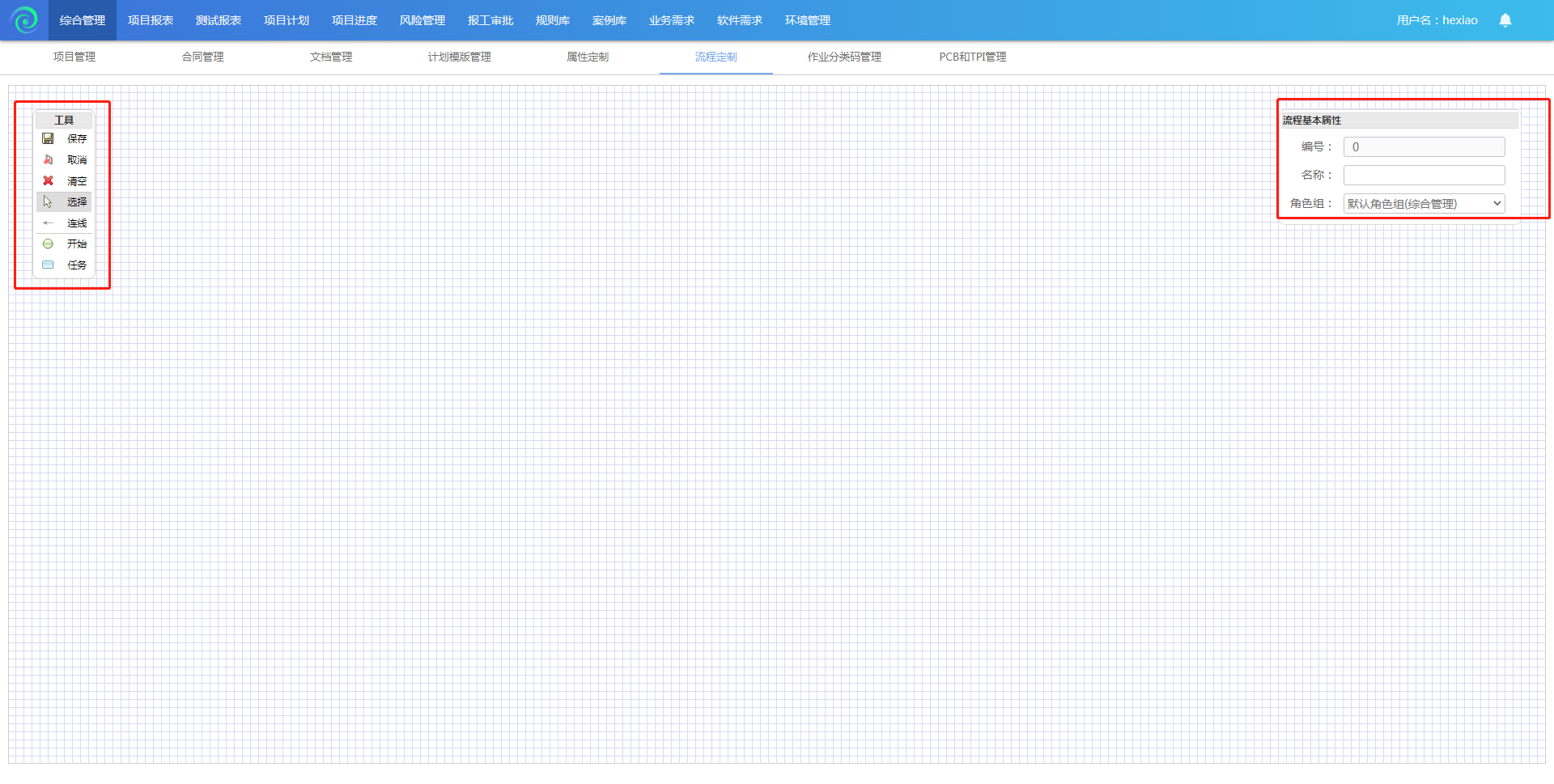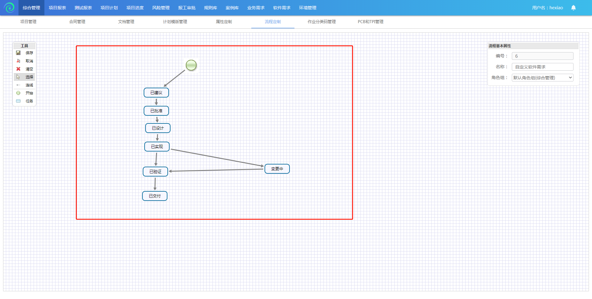 新增软件需求流程的方式与新建缺陷流程一致,左侧是工具栏(开始、任务、连接线等),右侧是流程基本属性设置(流程名称、用户角色组设置等);
